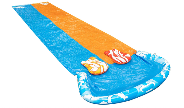 Who’s ready to race? This double slide sprinkler slide comes with two bodyboards for a racing good time.