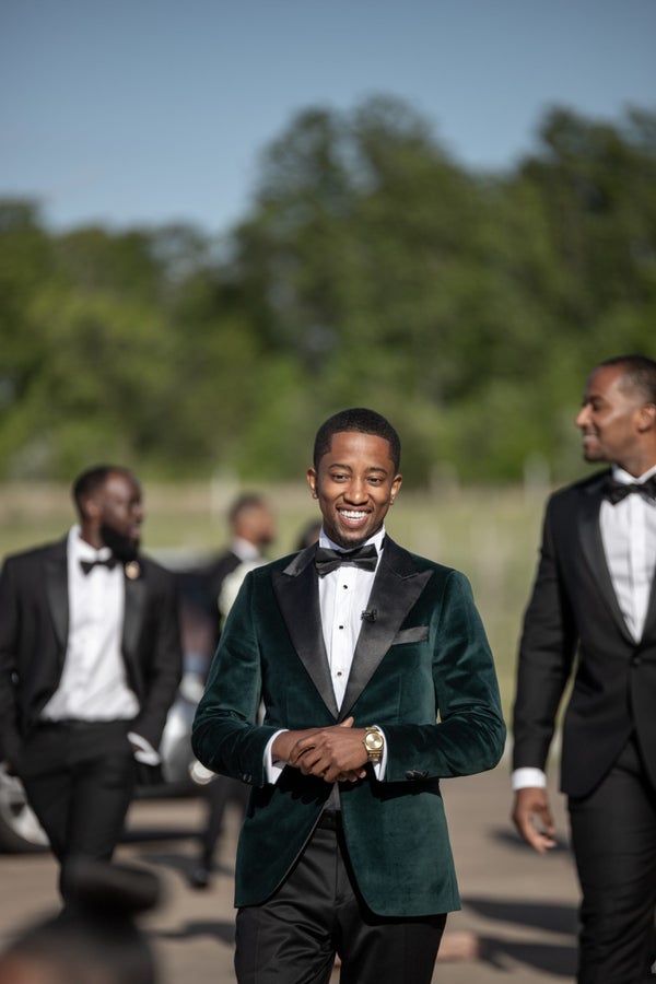 05The Groom in VelvetAs for the groom, Shakeel wore a custom velvet emerald green Indochino tuxedo with calf hair Salvatore Ferragamo loafers. He looked sharp alongside his groomsmen.