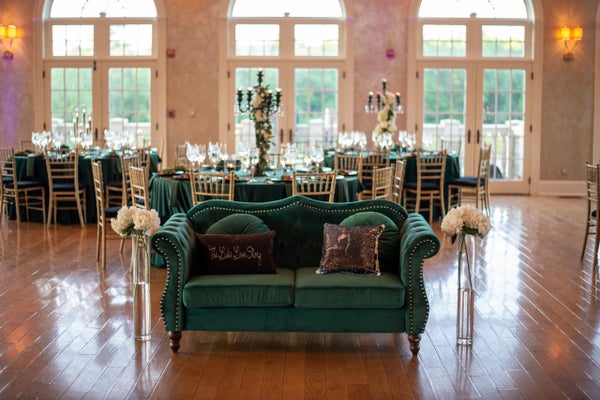 03The DecorEmerald green with black and gold accents were the colors Nia wanted to go with for her big day. Aside from the velvet and satin green fabrics, and the white flowers, the black candelabra centerpieces were the bride’s favorite. Not pictured are other fun additions to the venue, including a cigar bar, a photo booth, and the bar, which was covered in white rose petals.