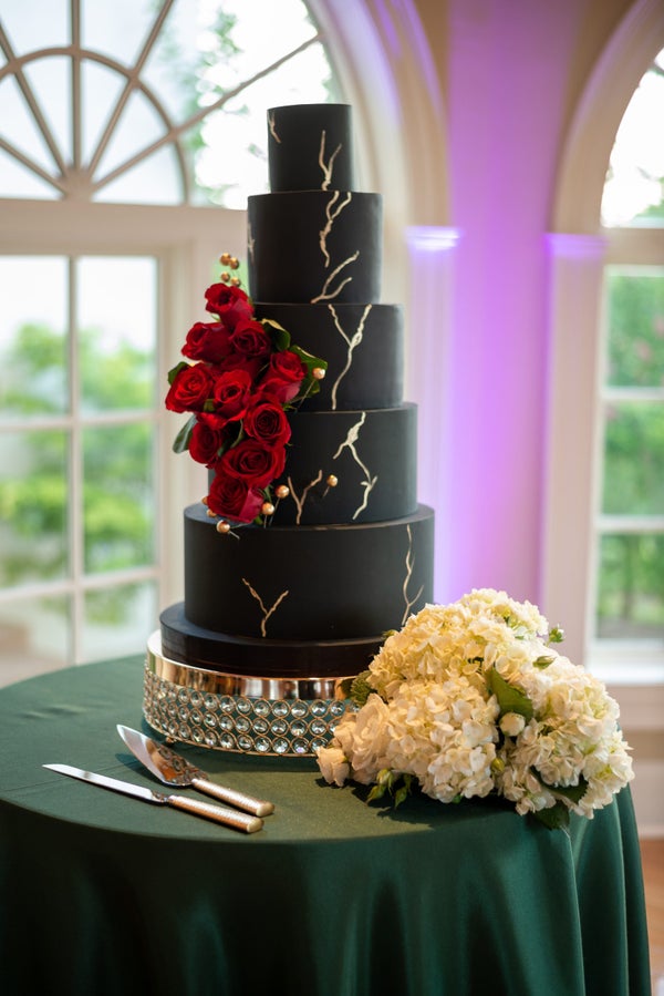 06The Untraditional CakeIt’s not very often you get to see not only a black wedding cake, but also one with a different flavor in every slice! This five-tier dream was made by Le Cake Boutique and included vanilla with buttercream, red velvet, chocolate mousse and a chocolate bottom.