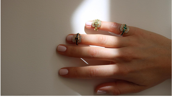available at harwellgodfrey.com $3800 BUY NOW 04RING IN THE NEWParisian pals Kelly, a gemologist and Kelia, a passionate antique jewelry collector have come together and created Rainbow K. These millenials aim to create new, stylistic alternatives to classical art-deco design. Rainbow K 18K Yellow Gold Shield Ring with Tourmaline.
