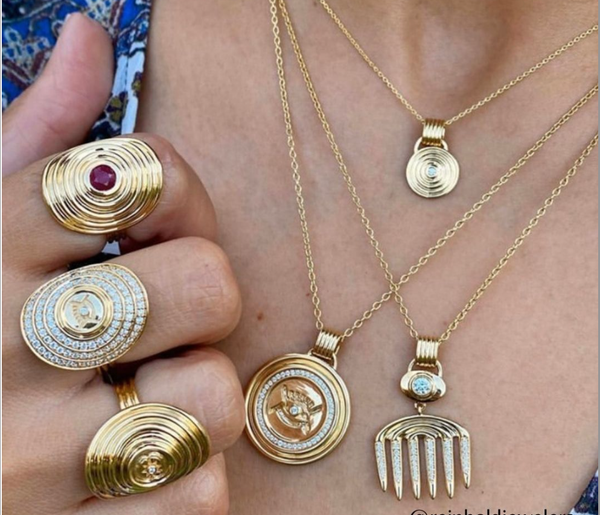 available at netaporter.com $430 BUY NOW 06INSTANT HEIRLOOMSParis-born to Beninese parents, Catherine Starr, the founder of Almasika, now based in Chicago, launched her brand in Paris in 2014. After completing a masters in business from the University of Paris XII, her passion for jewelry took her to London where she worked with DeBeers and the World Gold Council, most-importantly within their global markets. That work took her to India, China and Japan, where she became fascinated with jewelers and how they link their stories and culture into their designs. That sentiment would eventually carry over into her line. The word “almasi” means “diamond” in Swahili and “Sika” means “gold” in many West African languages.This photo (along with the gold and rube necklace in the opening photo for this gallery) includes pieces from her “Sagesse” collection, handcrafted in 18K gold with responsibly-sourced diamonds and precious gemstones. The ancient symbols within the designs represent traditional wisdom, “sagesse” is French for “wisdom.” Sagesse Minimialist Talismans