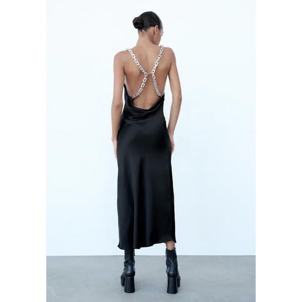 available at Zara $30, originally $50 Shop Now 15Zara Chain Strap Satin Effect DressClassic in the front, party in the back.