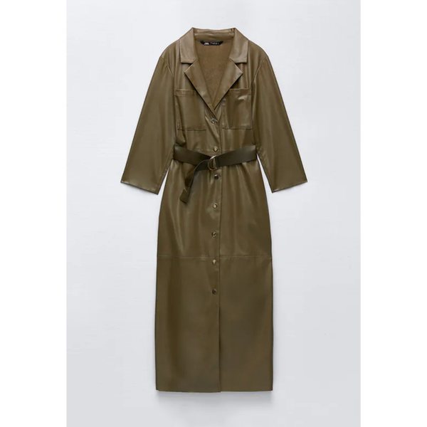 available at Zara $50, originally $70 Shop Now 12Zara Faux Leather Shirt Dressolive green and faux leather are a match made in heaven.