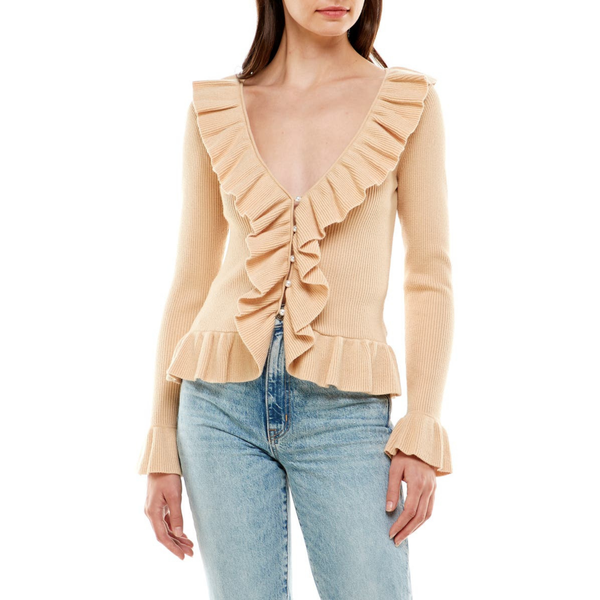 available at Nordsrtom $20, originally $491Shop Now https://www.nordstrom.com/s/wayf-deena-off-the-shoulder-rib-knit-crop-top/5842844?origin=category-personalizedsort&breadcrumb=Home%2FBrands%2FWAYF&color=480 12WAYF Ruffle Trim Rib CardiganIntroducing the cutest cardigan ever.