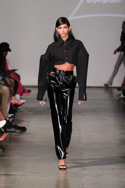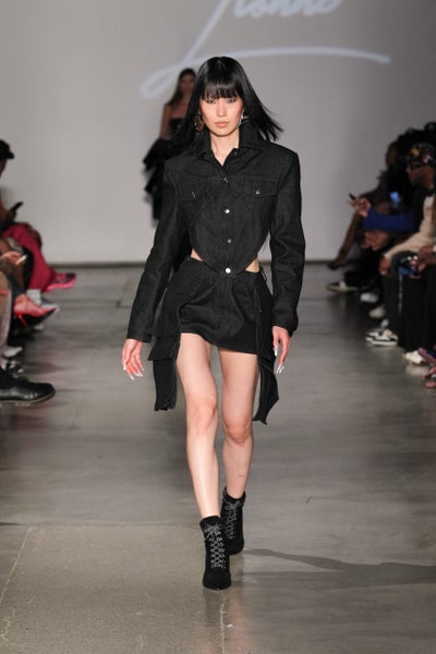 Over on the runway, models were mostly doused in black, save for brief moments of orange, white, and blue denim. However, an emphasis on the shade in high-sheen fabrics (there were tube tops, mini skirts, matching sets, and trench coats all in what look to be vinyl or patent leather materials) catapults the designs into a territory that is anything but quiet and minimal. In fact, elevating basics far beyond their norm is exactly what Fitzgerald does best, her knack for elongated sleeves, oversized collars, and off-kilter structural silhouettes coming together in unison on the runway. It’s an element that has quickly become a recognizable signature for Lionne, and Fitzgerald tells ESSENCE this collection is a natural progression, with growth, from the last. Beyond aesthetic choices, the collection signals other ways the brand continues to grow, as its first collection produced in Italy (Fitzgerald took fans behind the scenes on Instagram), with an emphasis on higher quality.